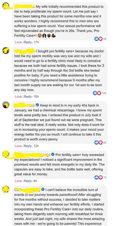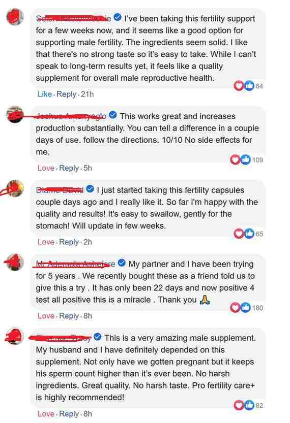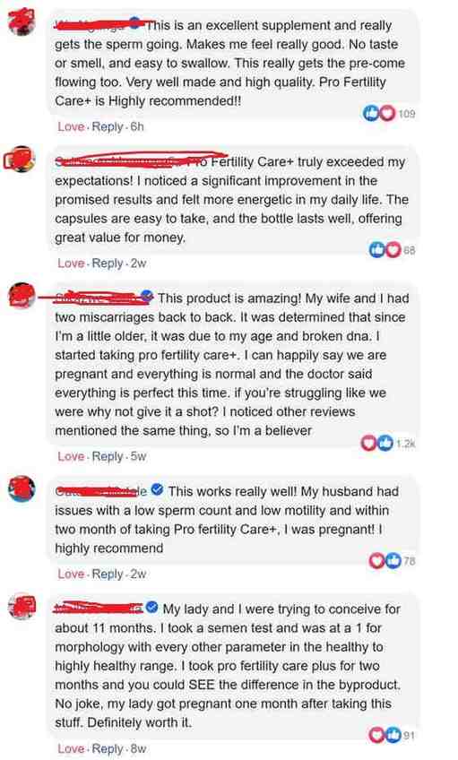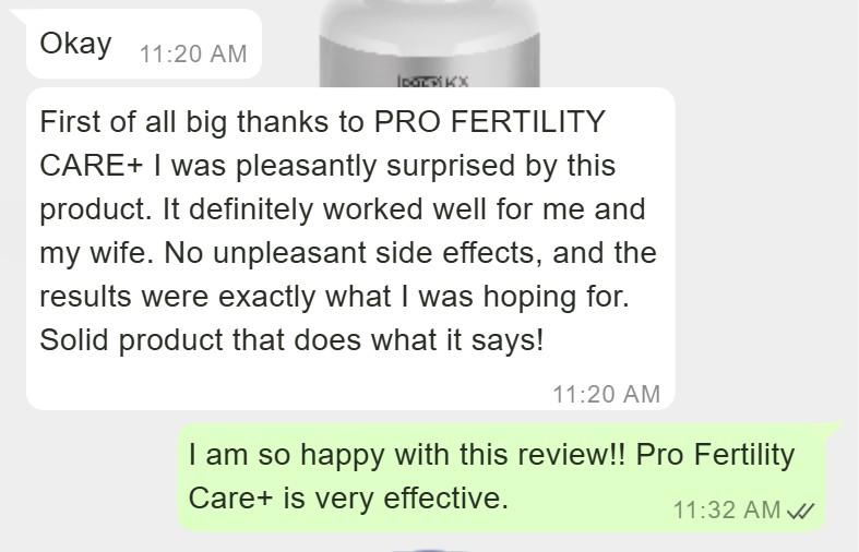 "My husband noticed a difference in his semen appearance... The volume was larger and quality was different he reported, since taking pro fertility care. We conceived after he was on it a few months and now he doesn't want to stop taking it because he also said it is doing something or improving his desire or performance or testosterone Interesting, but he seems to like it"